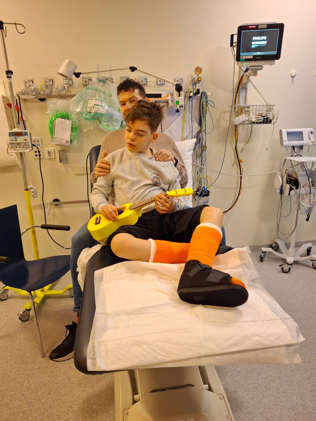 We werden warm en rustig ontvangen door de pedagogisch medewerker. In alle rust kregen we uitleg en werden de laatste dingen doorgenomen. En… we mochten alvast een kleurtje voor het gips uitzoeken. Het is Olympisch oranje geworden! 🧡De verpleegkundige gaf Gideon zijn midazolam en dat ging ontzettend goed. Wat een topper is hij toch. Toen hij wat wiebeliger werd, legden we hem op de behandeltafel. Hij vond het allemaal prima.