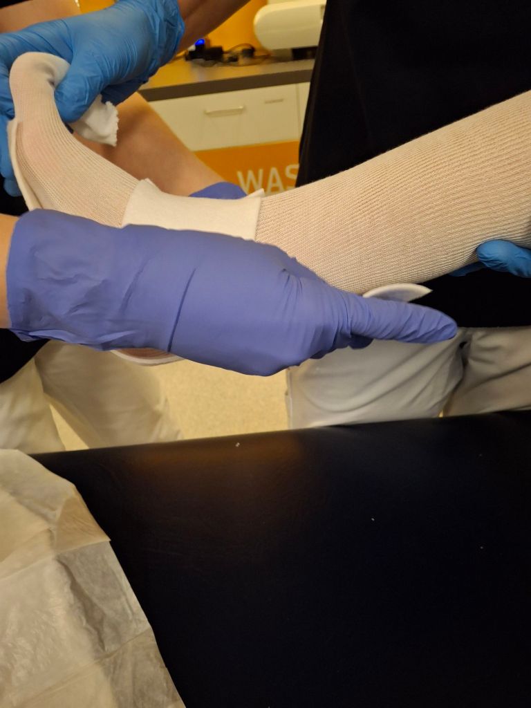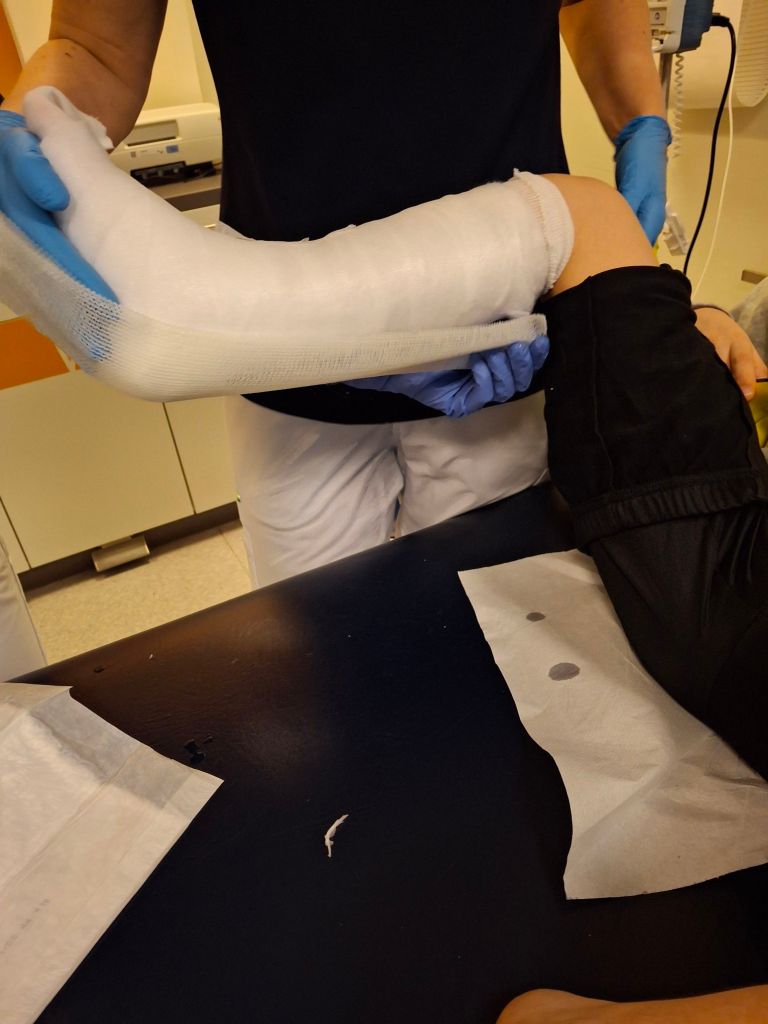 De dames van de gipskamer werkten ontzettend kundig en zorgvuldig. Wat een toppers. Nog geen minuut later stond de prikster van het lab al binnen. Perfecte timing — het roesje werkte nog nét voldoende. De ervaren prikster had in een mum van tijd genoeg buisjes gevuld. Het ging soepel en rustig.