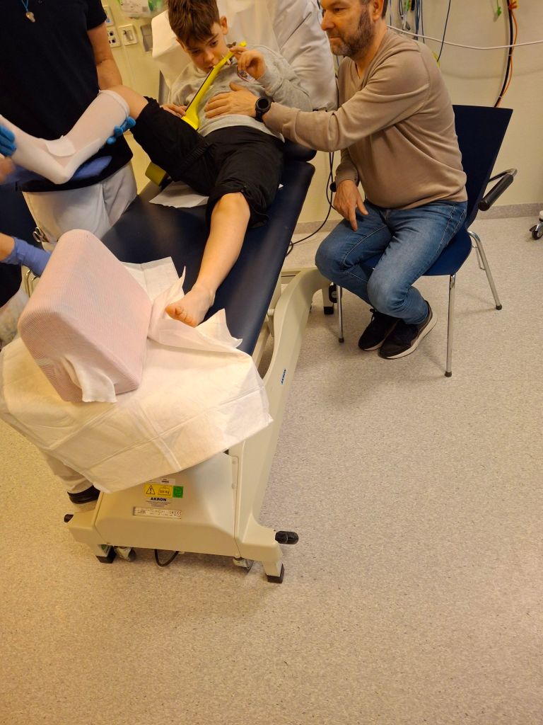 Al snel kwamen twee vriendelijke dames van de gipskamer binnen. Gideon vond het gezellig. Dat er aan zijn benen werd getrokken en geduwd, vond hij wat minder 😉 Maar hij liet het goed toe. Ze brachten zijn voeten voorzichtig in de juiste stand. Ondanks het roesje kostte het veel kracht om zijn voeten goed te positioneren. Af en toe zagen en hoorden we hem ondeugend lachen. Ondertussen blies de pedagogisch medewerker bellen voor hem. Als er een bel op hem kapot knapte, duurde het een paar seconden… en dan kwam zijn lach. Zo mooi om te zien.