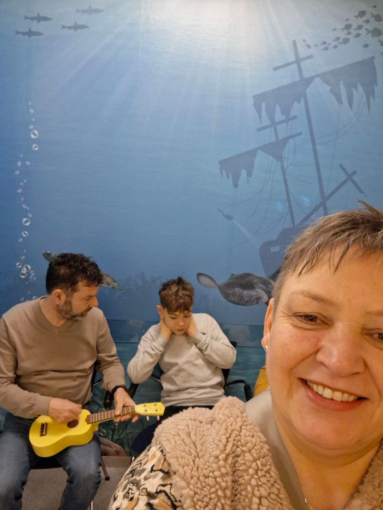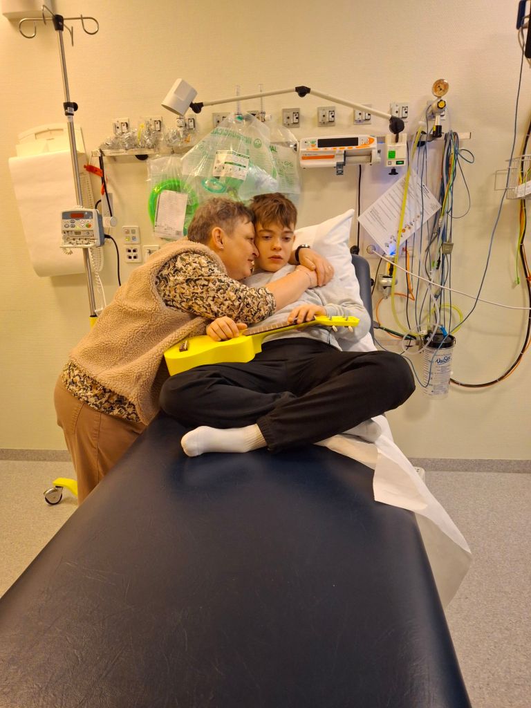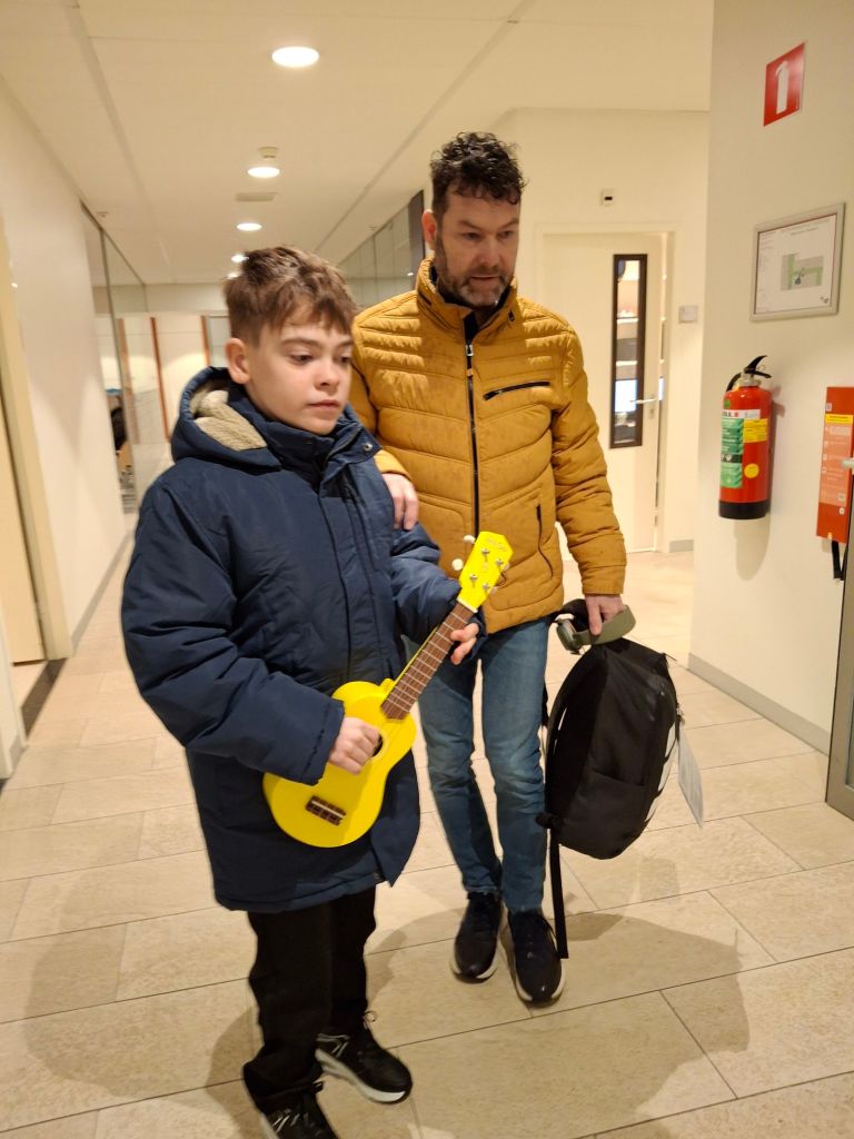 Tijdens ziekenhuis bezoeken, winkelen en wandelingen zit Gideon graag in de buggy. Het liefst heeft hij dan zijn gitaartje mee. Hij zit dan prinsheerlijk te spelen en op zijn manier te zingen. Ook hier zijn wij inmiddels helemaal aan gewend. In een winkel hoorde ik mensen tegen elkaar zeggen; “Waar komt toch die muziek vandaan?” Ik dacht bij mezelf; “Muziek? Ik hoor helemaal geen muziek” Ondertussen wandelde ik met Gideon in de buggy vlak langs hen. Die mensen schoten in de lach en zeiden tegen elkaar; ” O, kijk deze jongen maakt muziek!”