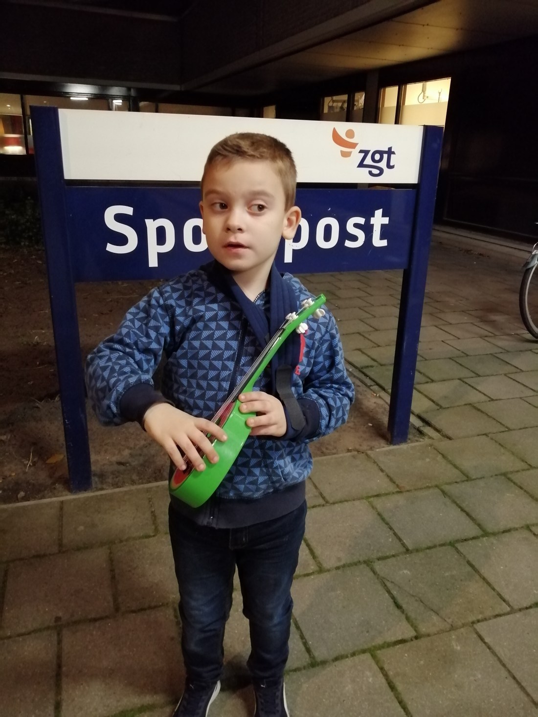 Gideon zit goed gemutst, met zijn gitaar in zijn handen, in de buggy en dat zonder eten of drinken. Wat een kanjer is het toch!